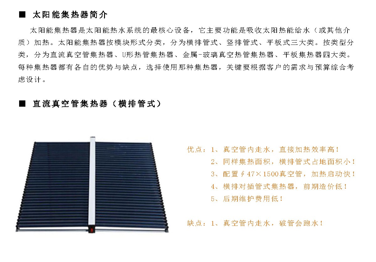 真空管型太陽(yáng)能集熱器(橫排式)主要應(yīng)用于熱水系統(tǒng)工程、采暖系統(tǒng)工程,適用非承壓系統(tǒng)!詳細(xì)介紹請(qǐng)進(jìn)入產(chǎn)品詳情了解>>>