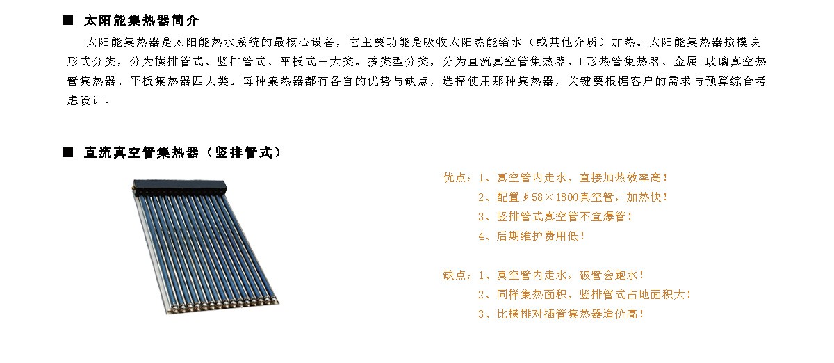 真空管型太陽能集熱器(豎排式)主要應(yīng)用于熱水系統(tǒng)工程、采暖系統(tǒng)工程,適用非承壓系統(tǒng)應(yīng)用!詳細(xì)介紹請進(jìn)入產(chǎn)品詳情了解>>>