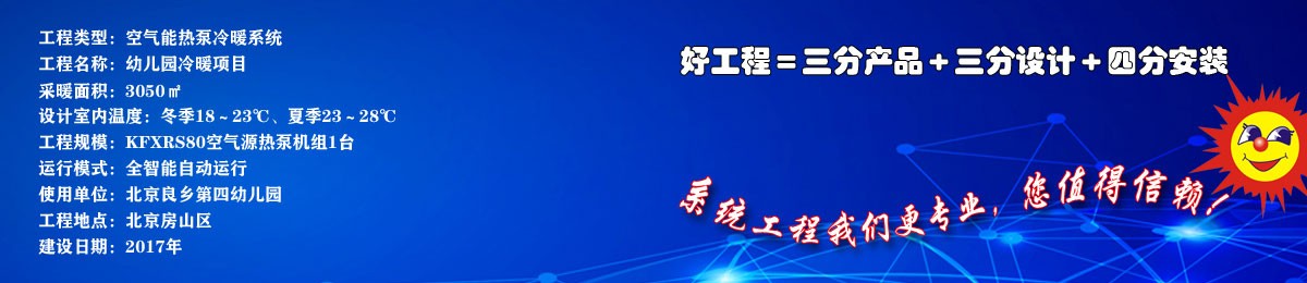北京房山區(qū)良鄉(xiāng)第四幼兒園空氣源熱泵采暖、制冷項(xiàng)目,建筑面積3050㎡、設(shè)計(jì)冬季室內(nèi)溫度18~23℃、夏季室內(nèi)溫度23~28℃,配置KFXRS80空氣源熱泵冷暖機(jī)組1臺(tái),效果良好、節(jié)能顯著!
