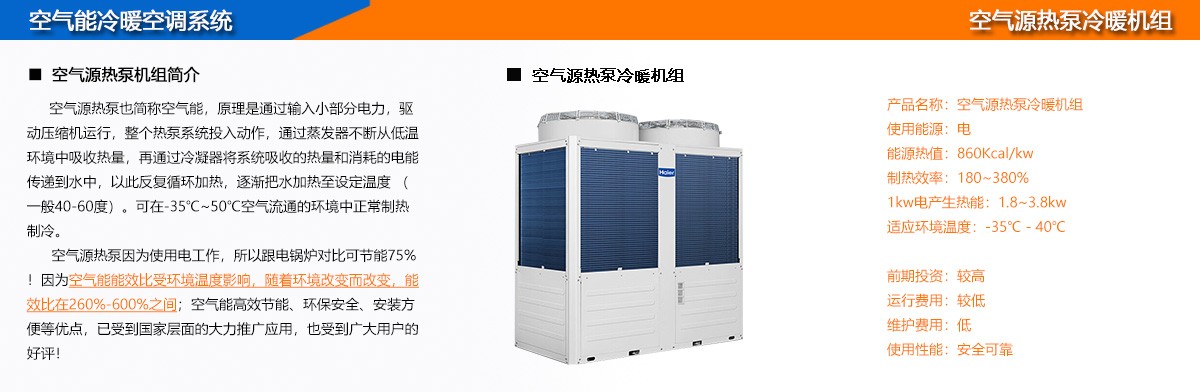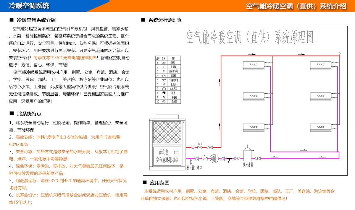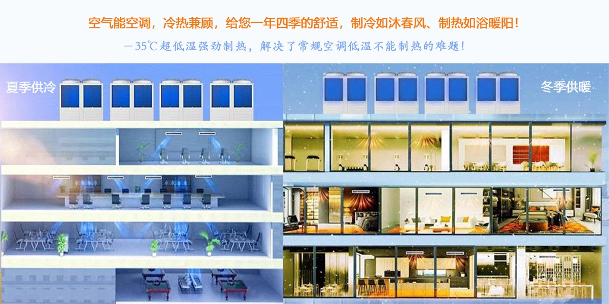 空氣能冷暖空調(diào)系統(tǒng)節(jié)能、環(huán)保、舒適!-35℃極寒環(huán)境無(wú)需電輔照樣制熱!適用于別墅、賓館、酒店、公寓、醫(yī)院、學(xué)校、寫(xiě)字樓、商城、園區(qū)等各類單位供暖供冷。