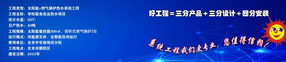 北京中學(xué)西壩河分校學(xué)生宿舍洗浴熱水項(xiàng)目。采用太陽(yáng)能+燃?xì)忮仩t熱水系統(tǒng),配置太陽(yáng)能集熱器300㎡,90KW容積式燃?xì)忮仩t3臺(tái),環(huán)保、安全、節(jié)能、可靠!
